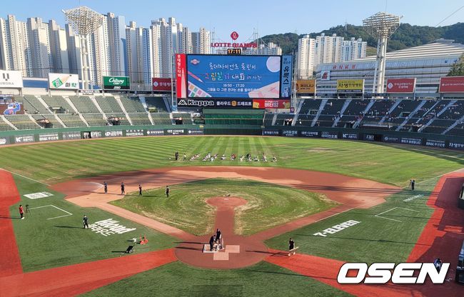 비온 뒤 논두렁이 된 사직구장 그라운드, 롯데와 KT 모두 피해자 [오!쎈 부산] 2023.08.26