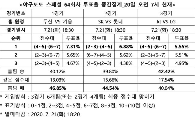 KBO 3경기 대상 야구토토 스페셜 64회차 투표율 중간집계
