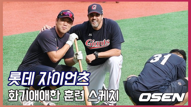 롯데 자이언츠의 화기애애한 그라운드 훈련이 진행되고 있는 가운데 최근 맹활약으로 스포트라이트를 한몸에 받고 있는 롯데 한동희와 슬럼프를 극복하고자 스스로 2군행을 원했지만 반려된 롯데 주장 민병헌이 그라운드 위에서 힘차게 훈련을 하고 있다. / rumi@osen.co.kr