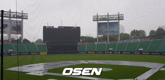 잠실구장에는 마운드와 내야에 방수포가 깔려 있다.